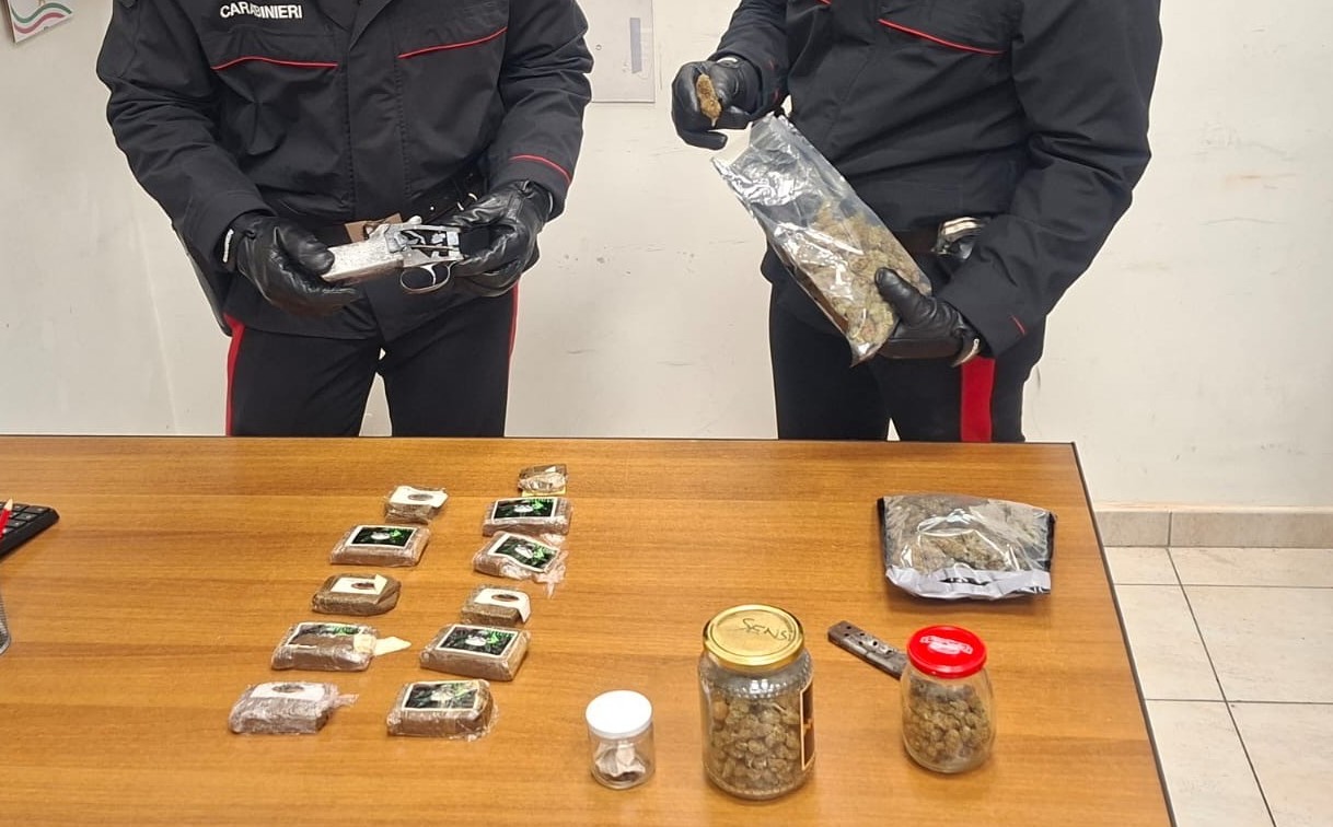 Dopo aver bloccato l’uomo, i militari hanno effettuato una perquisizione nella sua abitazione rinvenendo il castello, completo di scatola di scatto, di un fucile calibro 12 risultato provento di furto, nonché oltre un chilo di sostanze stupefacenti – tra hashish e marijuana – suddivise in panetti e buste occultate in un mobile della cucina.